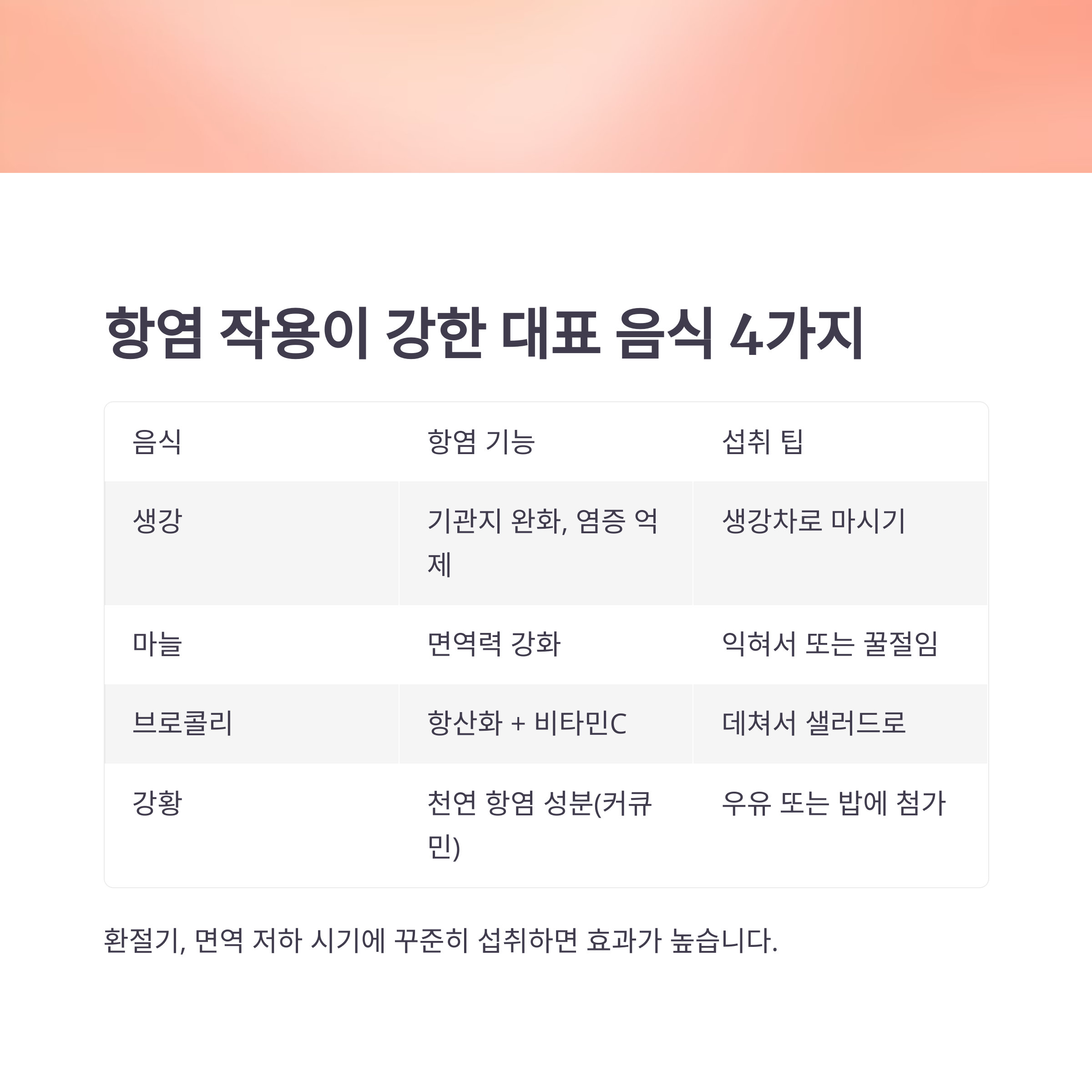염증 유발 유제품, 튀김, 밀가루 생강, 마늘, 브로콜리