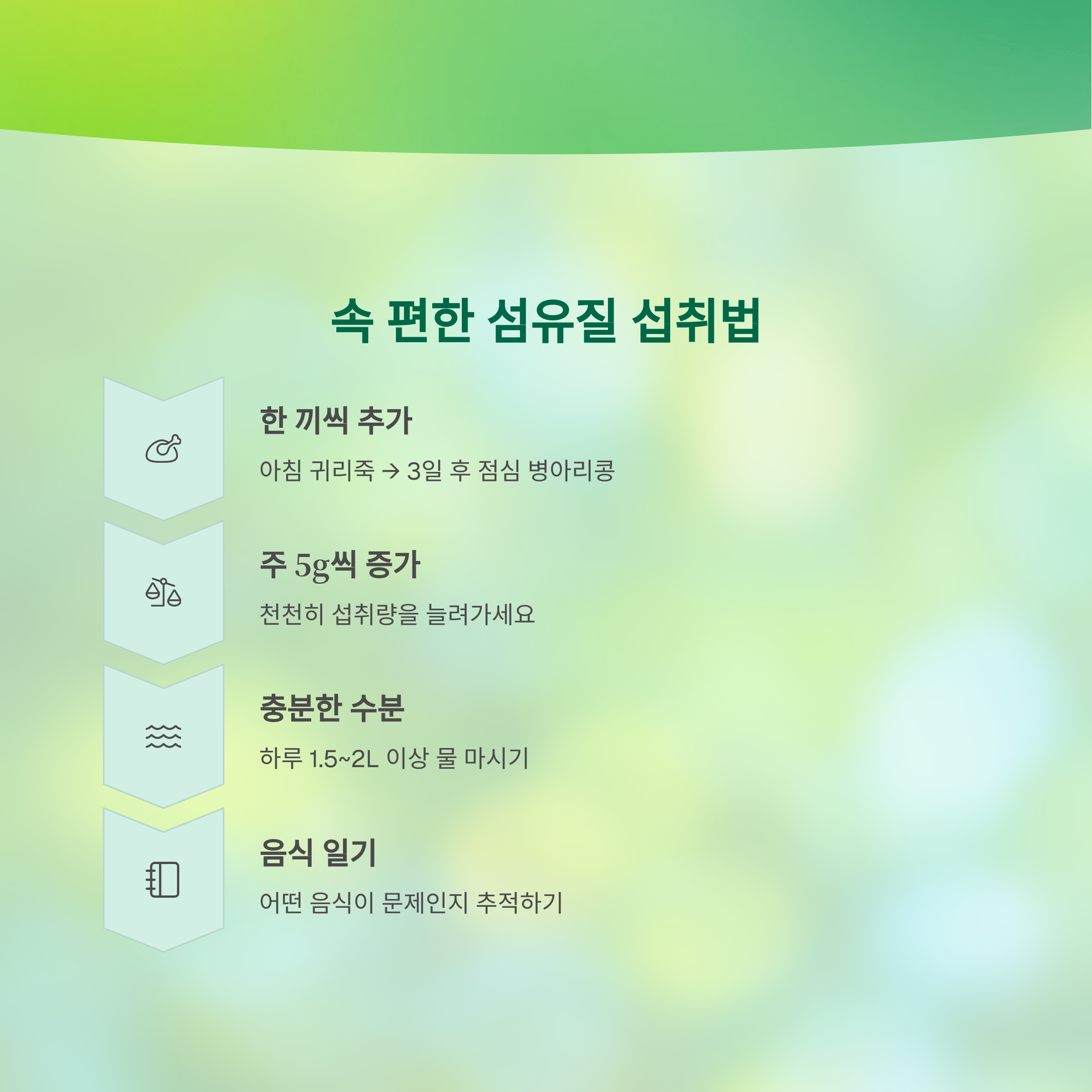 천천히, 꾸준하게, 충분한 물과 함께 섭취하면 속 편하고 건강한 식생활을 실천할 수 있습니다.