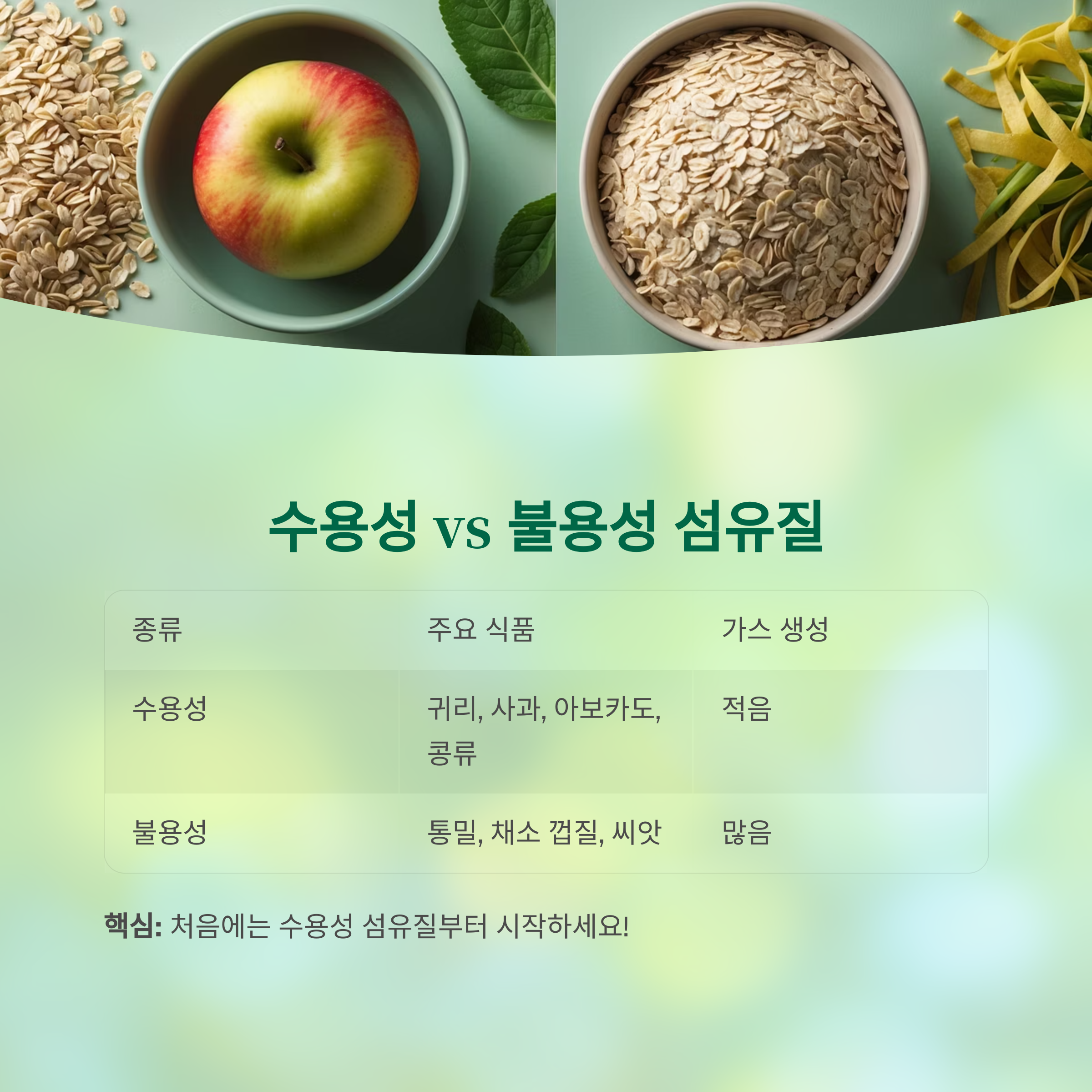 수용성 섬유질 수분을 흡수해 젤 형태로 변하며 배변을 부드럽게 함 귀리, 사과, 아보카도, 콩류 적음