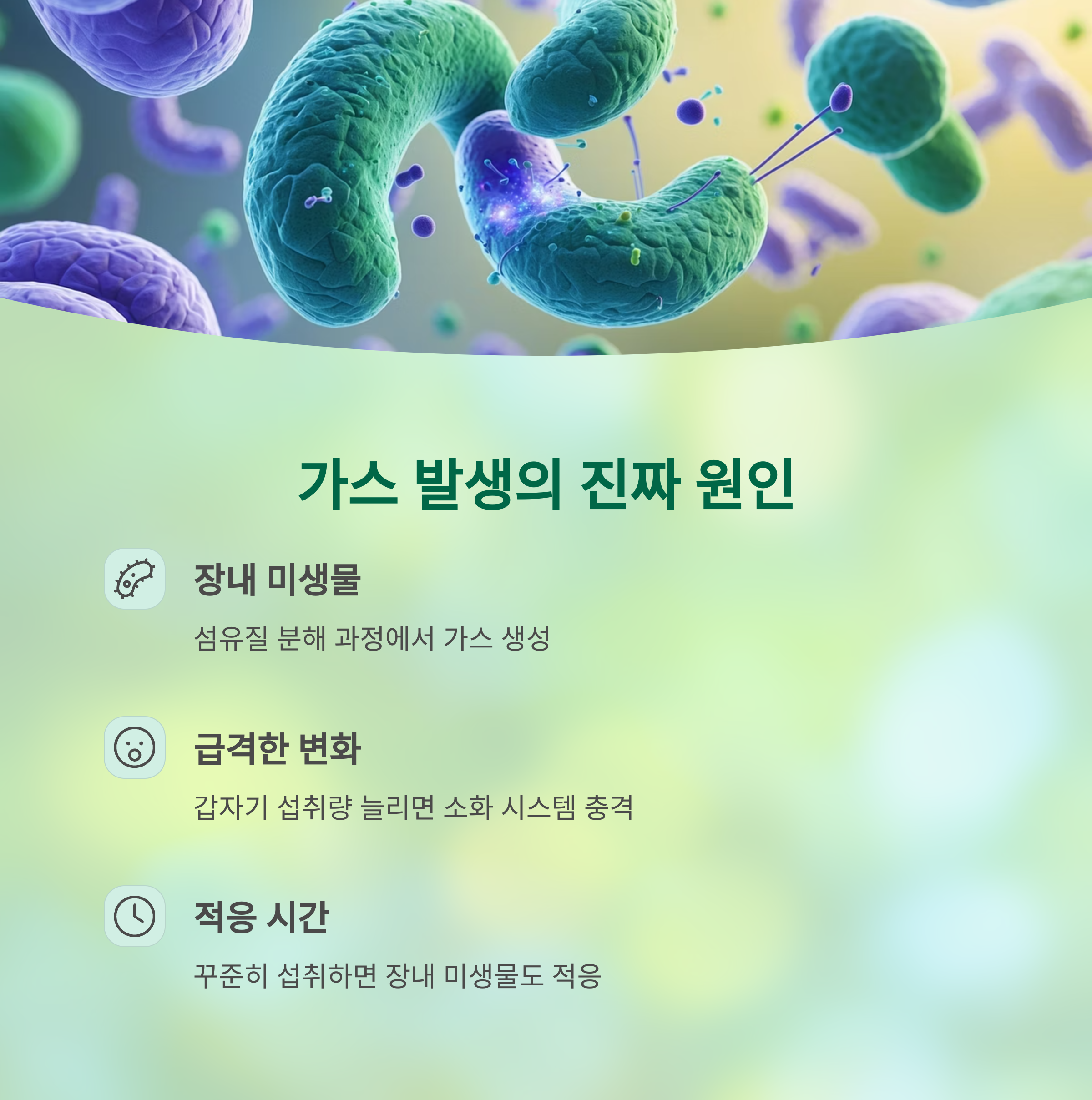 우리 장내 미생물은 섬유질에 적응하며 점차 가스와 복부팽만을 줄여줍니다.