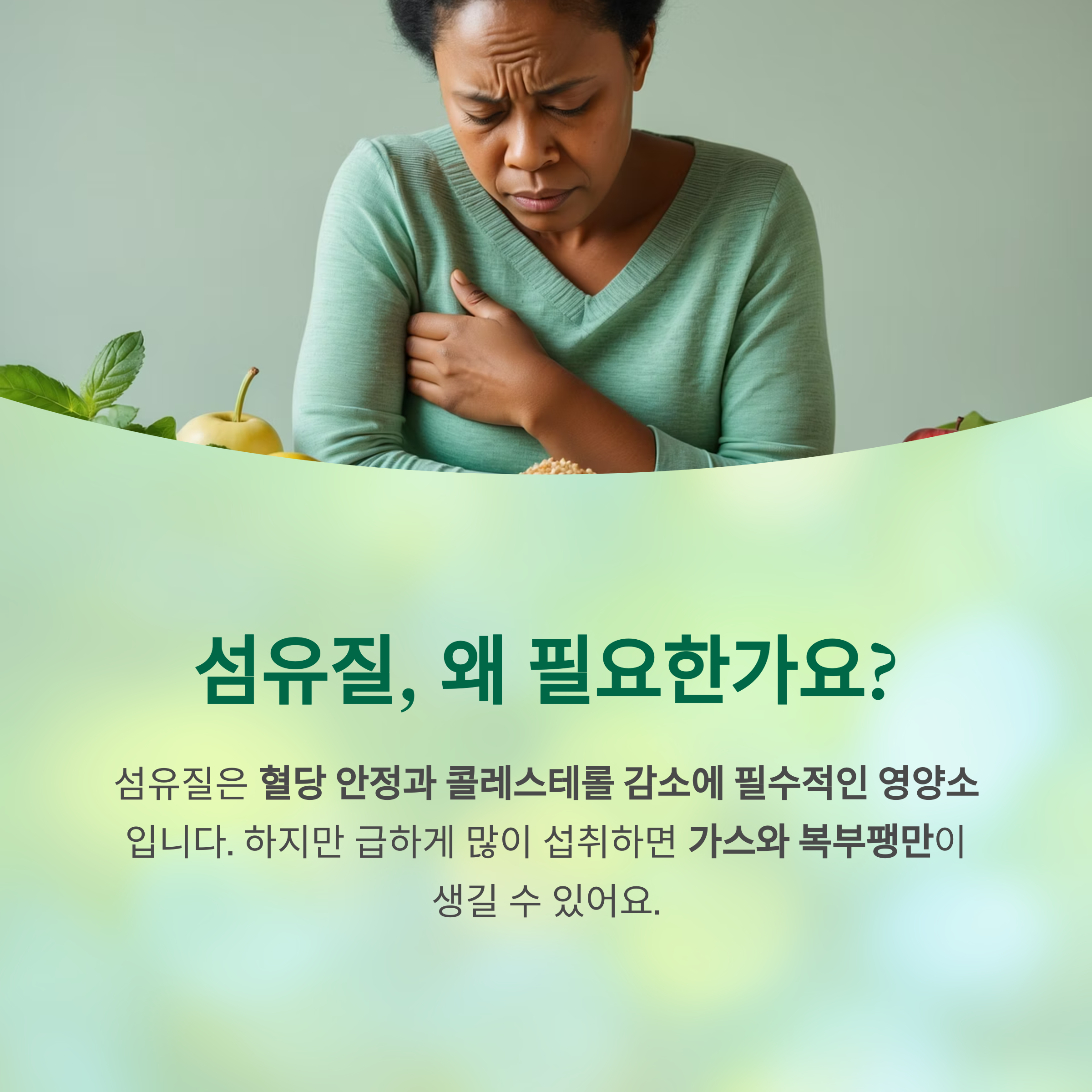 "건강을 위해 섬유질을 많이 먹으라는데, 먹기만 하면 속이 더부룩하고 가스가 차요.